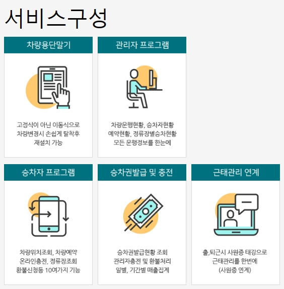 승하차 프로그램은 차량위치조회/차량예약/온라인충전/정류장조회/환불신청 등 10여가지 기능을 제공하고, 근태관리 연계로 출퇴근시 사원증을 태그하여 근태관리를 한번에 할 수 있습니다. 또한 승차권발급현황 조회, 관리자충전 및 환불처리, 일별/기간별 매출집계가 가능합니다.