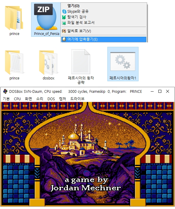 파일 다운로드 후 압축을 해제하고 prince > dosbox > 페르시아의왕자1 순으로 폴더 및 파일을 열어주시면 게임이 실행됩니다. 컨트롤 방법은 아까전에 말씀드렸던 것과 동일하고, 게임중 마우스가 보이게 하시려면 [Ctrl + F10] 버튼을 눌러주세요. 또한 [Atl + Enter] 버튼을 누르시면 전체모드 및 창모드 전환을 할 수 있습니다.