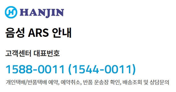 한진택배 고객센터 전화번호는 1588-0011번 또는 1544-0011번입니다. 개인택배 및 반품택배 예약, 예약취소, 반품 운송장 확인, 배송조회, 상담문의 서비스를 이용할 수 있습니다. 음성 ARS 서비스번호는 다음과 같습니다.