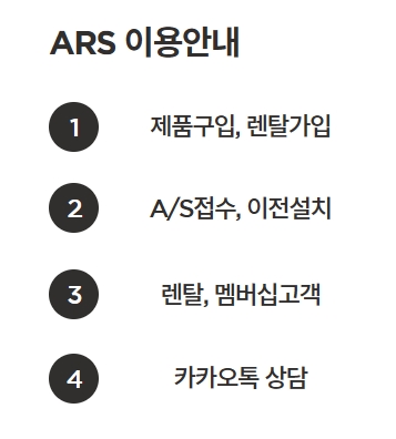 렌탈/멤버십고객(ARS 3번) 메뉴별 상담내용은 렌탈/멤버십 가입문의, 연락처, 정기점검 문의, 렌탈료/만료일자, 요금문의/요금납부, 정보변경/설치, 세금계산서 문의, 계약/해지문의, 각종변경/설치관련문의가 있습니다. 다이렉트 서비스는 결제관련/입금확인증, 이전설치접수, 연락처, 각종변경/설치관련문의, 계약내용이 있습니다.
