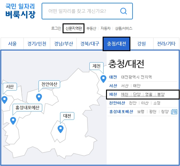 오늘은 제천 벼룩시장 구인구직 게시판 이용하는 방법과 주의사항에 대하여 알아보려고 하는데요, 벼룩시장 홈페이지에 접속하여 [신문지역판] 메뉴로 들어가서 [충청/대전] 지역의 [제천] 항목을 선택하여 해당 페이지를 열 수 있습니다.