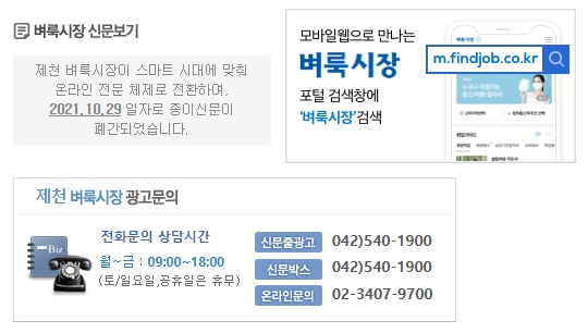종이신문 그대로보기 서비스를 이용하고 싶으신 분들도 있는데요, 제천 벼룩시장의 경우 2021년 10월 29일자로 폐간되었다고 합니다. 타 지역의 벼룩시장 신문의 경우 해당 서비스를 제공하는 지역도 있습니다.