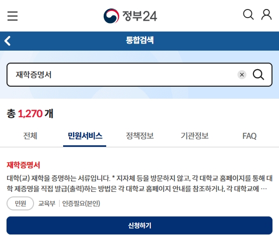 정부24 홈페이지(정부24 (gov.kr))에 접속하셔서 메인화면에 있는 검색창을 활용하여 [재학증명서] 정도로 키워드를 잡고 검색하시면 [민원서비스] 탭에서 해당 민원을 찾을 수 있습니다.