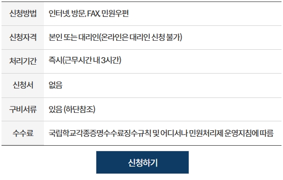 신청은 인터넷/방문/팩스/민원우편으로 할 수 있고, 본인이나 대리인이 신청할 수 있으며, 온라인으로는 대리인 신청이 불가합니다. 처리기간은 즉시이고, 신청서는 없으며, 방문신청시 구비서류가 필요합니다. 수수료는 국립학교 각종 증명수수료 징수규칙 및 어디서나 민원처리제 운영지침에 따릅니다.