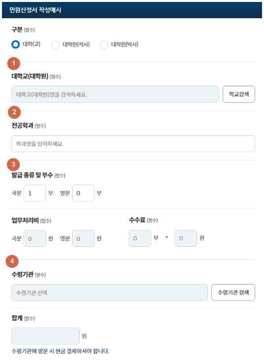 민원신청서 작성예시는 아래 그림과 같습니다. 각 번호별로는 1번 : 학교검색 버튼을 눌러서 대학교(대학원) 입력, 2번 : 전공학과 입력, 3번 : 발급하고자 하는 부수 입력, 4번 : 수령기관 검색버튼을 눌러서 증명서를 수령하고자 하는 수령기관 입력을 합니다.