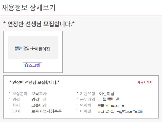 저도 임의로 채용정보 하나를 선택하여 상세페이지를 열어보았습니다. 어느 어린이집에서 연장반 선생님을 모집하고 있는데요, 스크랩도 가능하지만 로그인한 회원만 가능합니다.