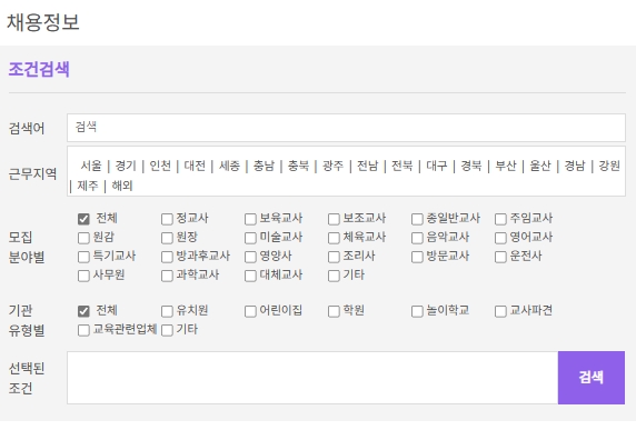 모집분야별로는 정교사, 보육교사, 보조교사, 종일반교사, 주임교사, 원감, 원장, 미술교사, 체육교사, 음악교사, 영어교사, 특기교사, 방과후교사, 영양사, 조리사, 방문교사, 운전사, 사무원, 과학교사, 대체교사, 기타가 있습니다.