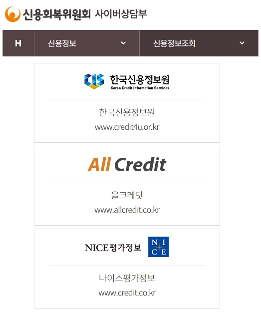 신용정보조회 서비스는 한국신용정보원, 올크레딧, 나이스평가정보 사이트를 활용하여 이용할 수 있으며 사이트주소는 위의 그림을 참고하시기 바랍니다.
