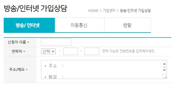 비회원 간편상담 페이지(전화상담신청, 가입센터 - (주)딜라이브 (dlive.kr))에 접속하시면 신청정보를 입력하여 방송/인터넷, 이동통신, 렌탈관련 상담을 신청할 수 있습니다.