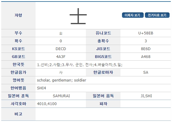 원하는 한자를 찾았을 때 보여주는 정보는 위의 표와 같습니다.