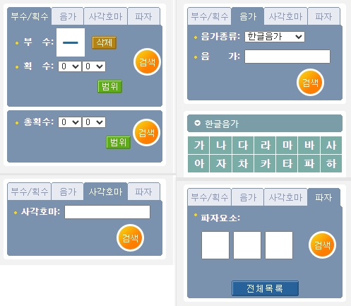 부수/획수 검색의 경우, [부수를 선택하세요] 영역에서 부수를 선택하고, 획수와 총획수를 입력하여 검색할 수 있습니다. 또한, 획수와 총획수의 범위를 설정하여 검색할수도 있습니다.