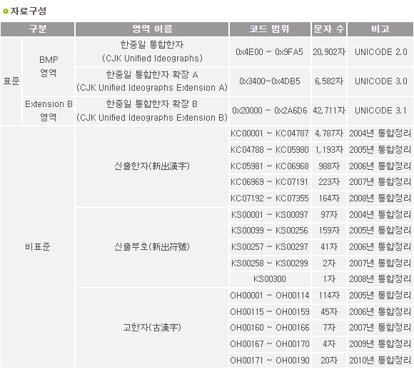 현재 제공되고 있는 한자의 영역과 숫자는 위의 표와 같습니다.