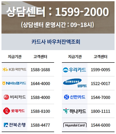 카드사 세부 업종분류 방식이나 가맹계약 여부 및 등록업종 상태 등으로 인하여 카드사별 사용처에 일부 차이가 발생할 수 있으며, 자세한 사항은 바우처 이용 카드사로 문의하시기 바랍니다.