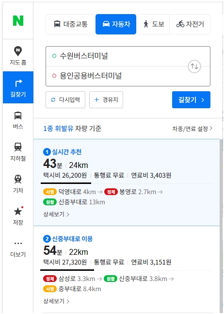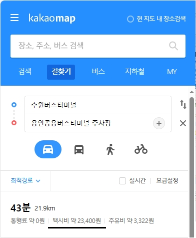 저는 수원버스터미널에서 용인공용버스터미널까지의 택시요금을 알아보았는데요, 경로에 따라서 차이가 있지만 대략 2만5천원~3만원 정도가 발생하겠네요.