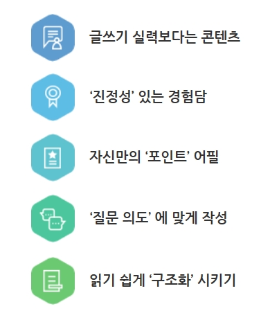 자기소개서 작성시 점검사항으로는 면접의 근거자료라는 점을 기억하기, 원하는 직무를 먼저 이해하기, 기업이 원하는 성향과 역량 파악하기, 경험에 대하여 구체적으로 작성하기, 부풀린 내용 없이 진정성있게 작성하기, 인사담당자의 가독성을 높일 수 있도록 문장의 길이 조절하기, 다른 지원자와 차별화된 나만의 이야기를 작성하기입니다.