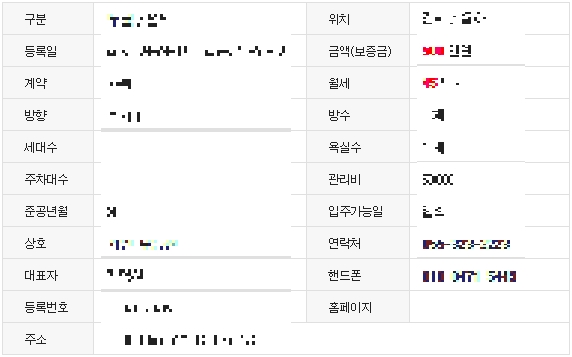 상세 페이지에서는 구분, 등록일, 계약, 방향, 세대수, 주차대수, 준공년월, 상호, 대표자, 등록번호, 주소, 위치, 금액(보증금), 월세, 방수, 욕실수, 관리비, 입주가능일, 연락처, 핸드폰, 홈페이지 정보와 게시자가 작성해놓은 간단한 글 내용을 확인할 수 있어요.