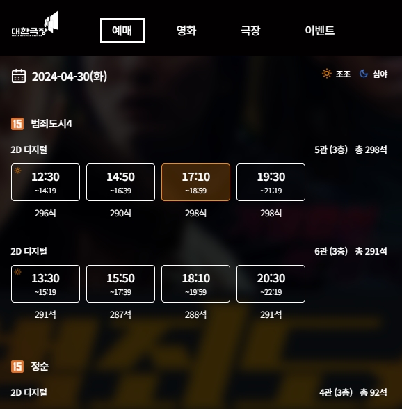 홈페이지(대한극장 (daehancinema.co.kr))에 접속하여 [예매] 메뉴를 선택하고, 날짜와 영화 및 상영시간을 선택하여 [좌석선택] 버튼을 누르시면 아래 그림과 같이 로그인 화면이 나옵니다.