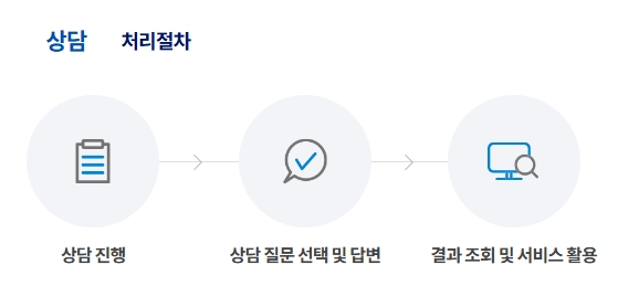 상담 처리절차는 상담진행 > 상담질문 선택 및 답변 > 결과조회 및 서비스활용 순입니다. 맞춤형 상담으로 보안피해 예방을 지원하고자 기업 사용자 및 개인 사용자 상담진행 서비스를 제공합니다.