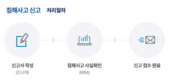 침해사고 신고 처리절차는 신고서 작성 > 침해사고 사실확인 > 신고접수 완료 순입니다. 작성방법 및 절차는 침해사고 유형 선택 > 개인정보 수집/이용 동의 > 기업 및 신고자 정보 > 사고현황 > 대응현황 순입니다.