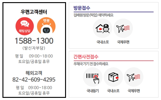 전자우편 또는 기타 우편관련 문의사항이 있으신 분들은 고객센터 1588-1300번을 이용해주세요. 운영시간은 평일 09시부터 18시까지 및 토요일과 공휴일은 휴무입니다.