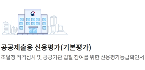 평가상품으로는 공공제출용 신용평가, 민간제출용 신용평가, 등급조회, ESG 평가, ESG 자가진단, 인증상품이 있습니다. 이중에서 오늘은 공공제출용 및 민간제출용 신용평가에 대하여 알아보겠습니다.