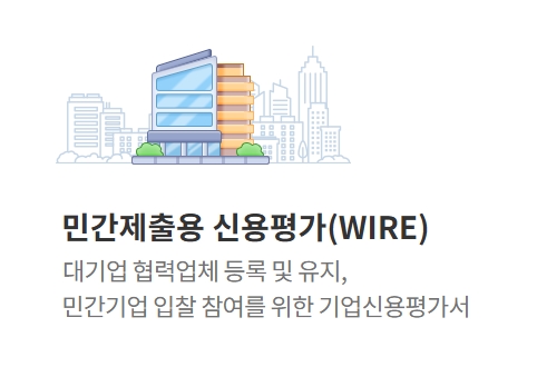 대기업 협력업체 등록과 유지 및 민간기업 입찰참여를 위한 기업신용평가서입니다. 자동 서류수집으로 준비서류가 없고, 평가기간은 신청일로부터 D+2영업일이며, 희망발급일 별도 지정으로 등급 유효기간에 맞춰 평가가 가능합니다.