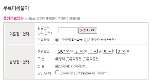 출생정보를 정확하게 입력하신 후 이용해주시고, 무료작명에서는 저장하기와 이름풀이가 제공되지 않으니 참고하시기 바랍니다.