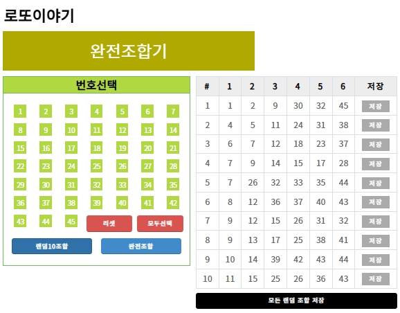 반드시 포함되어야하는 번호를 선택하고 [랜덤10조합] 또는 [완전조합] 버튼을 눌러서 결과를 확인합니다. 랜덤10조합은 최소 8개 이상의 번호를 선택해야 하고, 완전조합은 최소 6개 이상의 번호를 선택해야 합니다. [모두선택] 버튼을 눌러서 모든 번호들 중 조합을 뽑을수도 있습니다.