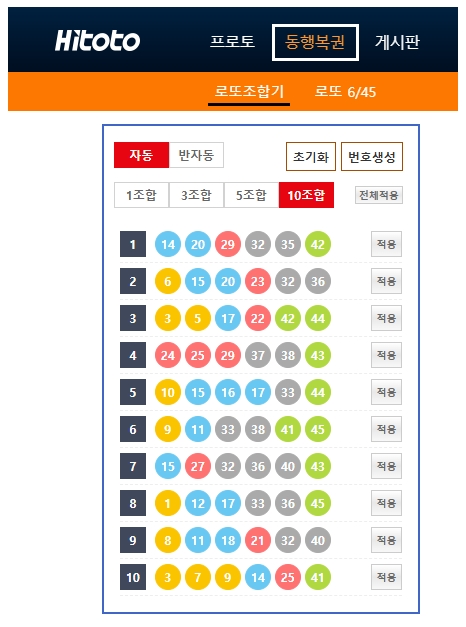 Hitoto 사이트의 [동행복권] 메뉴에서 로또조합기와 로또6/45 메뉴를 이용할 수 있습니다. 로또조합기를 활용하여 숫자를 수동으로 선택하거나, 자동 또는 반자동으로 1/3/5/10조합까지 뽑을 수 있어요.