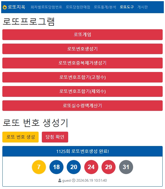 해당 사이트에서는 [로또도구] 메뉴에서 게임, 번호생성기, 번호중복제거생성기, 고정수/제외수 번호조합기, 실수령액계산기 서비스를 이용할 수 있습니다. 로또번호생성기 메뉴로 들어가시면 [로또 번호 생성] 버튼을 누를 때마다 랜덤하게 한가지 조합을 생성할 수 있어요.