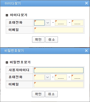 아이디 찾기의 경우, 휴대전화번호와 이메일주소를 입력합니다. 비밀번호 찾기의 경우 사용자아이디와 휴대전화번호 및 이메일주소를 입력합니다.
