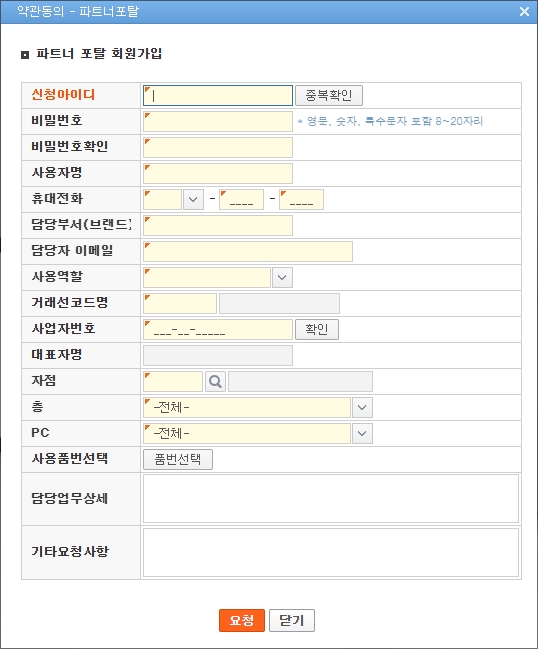 가입신청시 입력해야 하는 정보는 신청아이디, 비밀번호, 사용자명, 휴대전화, 담당부서(브랜드), 담당자 이메일, 사용역할, 거래선코드명, 사업자번호, 대표자명, 자점, 층, PC, 사용품번, 담당업무상세, 기타요청사항이 있습니다.