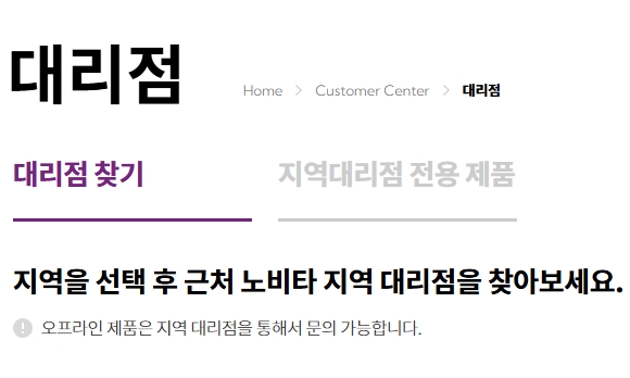 대리점 찾기 페이지(대리점 | CUSTOMER CENTER | 노비타(NOVITA))에 접속하시면 지역선택 후 여러분들의 근처에 있는 노비타 지역 대리점을 찾아볼 수 있습니다. 오프라인 제품은 지역 대리점을 통해서 문의할 수 있어요.