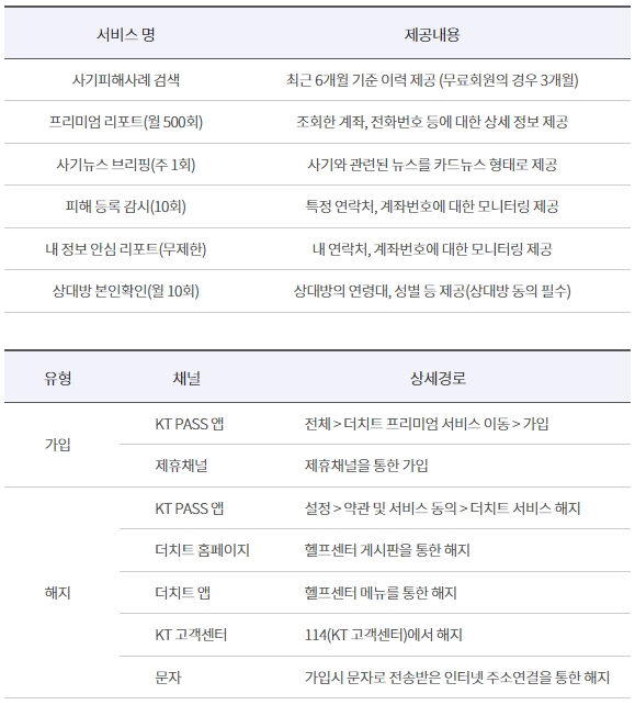 더치트 프리미엄 서비스는 만 14세 이상의 개인명의 고객만 서비스 가입 및 이용이 가능하며, 법인/외국인은 이용이 불가합니다. KT 회원 탈회 및 PASS 앱을 삭제할 경우에는 무료 서비스 및 프리미엄 서비스 이용이 불가합니다.