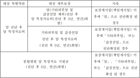 [갱신형] 특별약관 및 유사암진단 납입지원 특별약관은 보험기간 중 계약이 해지될 경우 해당 특별약관의 해약환급금을 지급하며, 암 진단 후 암 특정치료비 및 종합병원 암 특정치료 지원금(진단후 5년, 연간1회한) 특별약관의 경우 위 표의 사유에 해당하고 보험금 지급기간 이내에 계약이 해지될 경우 해당 세부보장의 계약자 적립액 및 미경과 보험료를 지급합니다.