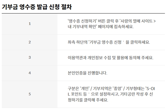 기부금 영수증 신청을 원하시면 포인트 기부 페이지에 접속하여 [소득공제 안내] 탭을 선택하고 [영수증 신청하기] 버튼을 눌러줍니다. 영수증 발급 신청 절차는 아래 표를 참고하세요.