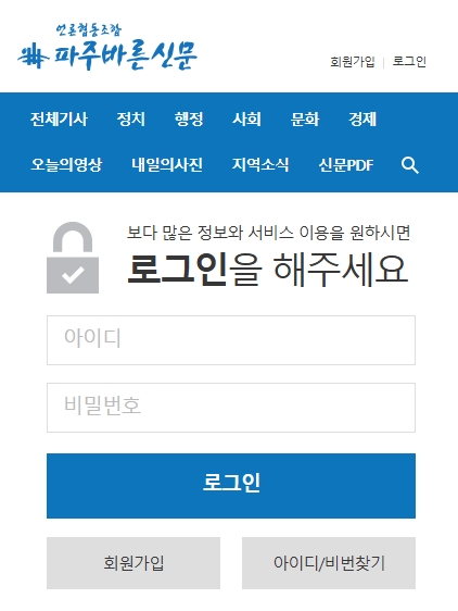 홈페이지 바로가기(파주바른신문 언론협동조합)에 접속하시면 위의 그림과 같이 전체기사, 정치, 행정, 사회, 문화, 경제, 오늘의영상, 내일의사진, 지역소식, 신문PDF 카테고리를 열람할 수 있습니다. 또한, 회원가입 후 로그인을 하시면 보다 많은 정보와 서비스를 이용할 수 있다고 하니 참고하세요.