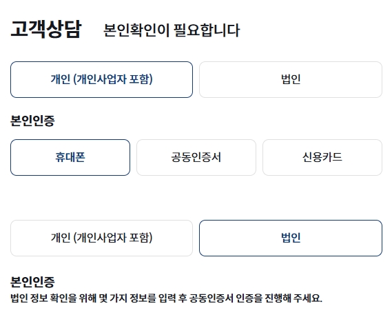 개인의 경우 개인사업자를 포함하며, 본인인증은 휴대폰이나 공동인증서 또는 신용카드로 가능합니다. 인증시 이름, 생년월일, 주민등록번호, 휴대폰번호, 카드번호와 같은 정보를 필요로 합니다.