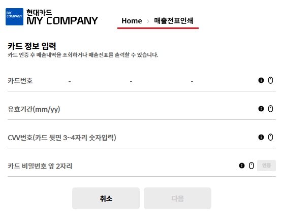 현대카드 MY COMPANY 홈페이지에 접속하여 [매출전표인쇄] 메뉴로 들어가시거나, 바로가기 링크(매출전표인쇄 - 현대카드 MY COMPANY)를 통하여 접속하시면 카드정보를 입력하여 카드인증 후 매출내역 조회 및 매출전표 출력을 할 수 있습니다.