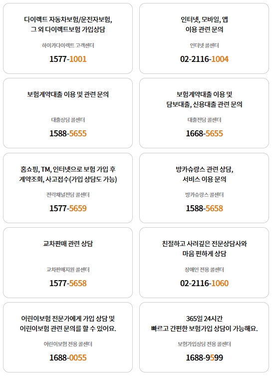 하이카다이렉트, 인터넷, 대출상담, 대출전담, 전략채널전담, 방카슈랑스, 교차판매지원, 장애인 전용, 어린이보험 전용, 보험가입상담 전용 콜센터 전화번호에 대해서는 위의 그림을 참고하시기 바랍니다. 이용가능 시간은 평일 09시부터 18시까지입니다.