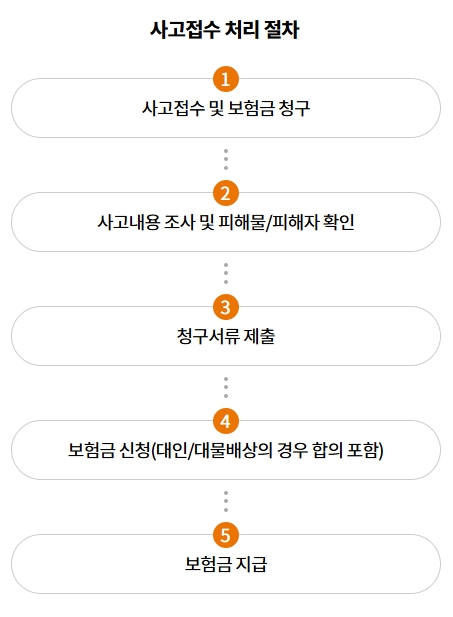 사고접수 처리절차는 사고접수 및 보험금 청구 > 사고내용 조사 및 피해물/피해자 확인 > 청구서류 제출 > 보험금 신청(대인/대물배상의 경우 합의 포함) > 보험금 지급 순입니다. 3년 이내에 발생한 사고에 대하여 청구할 수 있고, 보험금 확정일로부터 7일 이내에 지급됩니다.