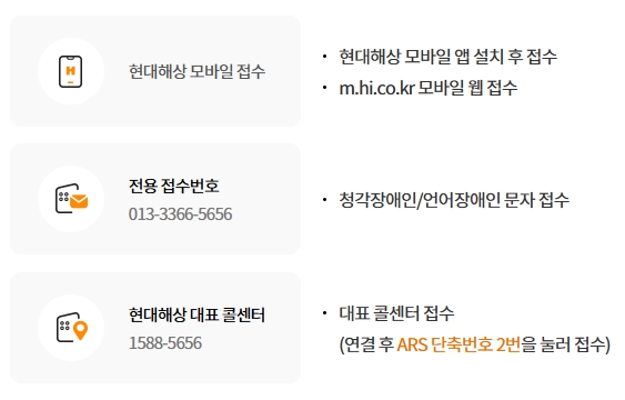 사고가 발생하면 현대해상 대표 콜센터 1588-5656번으로 연락하여 ARS 단축번호 2번을 눌러서 접수할 수 있습니다. 또는 현대해상 모바일 웹이나 어플리케이션을 통한 접수도 가능합니다. 청각장애인/언어장애인 문자접수 전용번호는 013-3366-5656번입니다.