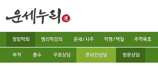 운세누리 홈페이지 바로가기(운세누리) 링크를 타고 접속하시면 정암학회, 명리학강의, 운세/사주, 작명/택일, 주역육효, 부적, 풍수, 무료상담, 온라인상담, 방문상담 카테고리를 열람할 수 있습니다.