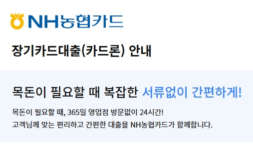 다양한 카드사에서 해당 상품을 제공하고 있는데요, 오늘은 농협 카드론 이용에 대한 안내를 드리고자 합니다.