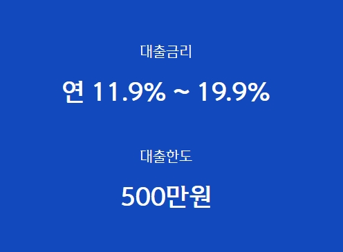 한도는 100만원 ~ 500만원이고, 금리는 현재날짜 기준으로 연 11.9% ~ 19.9%입니다. 대출금리는 기준금리에 가산금리를 더하여 계산합니다. 기준금리는 직전반기 신규정기예금 가중평균금리이고, 가산금리는 내부 등급 기준에 따라 차등 적용됩니다. 연체이율은 약정이율에 연체가산이자율(최대 연 3%)을 더하여 계산하고, 법정최고금리인 연 20% 이내입니다.