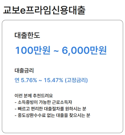 한도는 100만원~6,000만원, 금리는 연 5.76%~15.47%(고정금리), 중도상환 수수료는 없습니다. 기간은 5년~10년(연단위), 상환은 매월 원리금 균등분할 상환으로 합니다.