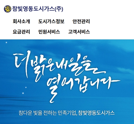 홈페이지(참빛영동도시가스)에 접속하시면 회사소개, 도시가스정보, 안전관리, 요금관리, 민원서비스, 고객서비스 메뉴를 열람할 수 있습니다.
