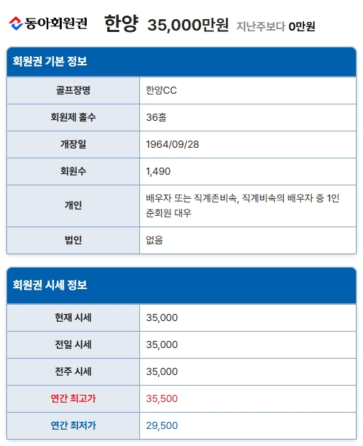 한양CC 회원권 시세는 현재 기준 3억5천만원입니다. 연간 최고가는 3억5천5백만원이고, 연간 최저가는 2억9천5백만원이네요. 과거 2018년 3월 기준 시세는 1억6천7백만원이었는데, 그때와 비교하면 2배도 더 올랐습니다.