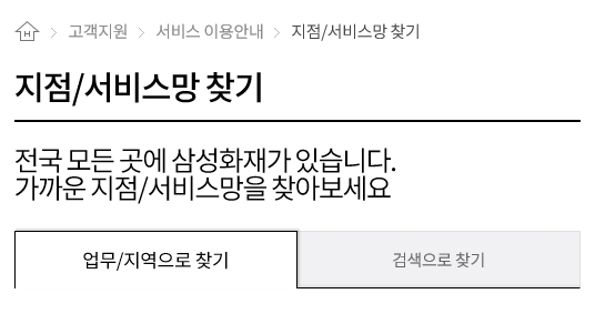 지점/서비스망 찾기 페이지(지점/서비스망 찾기 | 고객지원 - 삼성화재)에 접속하시면 업무/지역 또는 검색으로 찾을 수 있습니다. 센터별 서비스 및 업무내용은 다음과 같습니다.