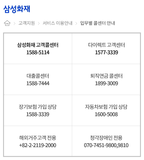 삼성화재 고객콜센터는 1588-5114번, 다이렉트 고객센터는 1577-3339번, 대출콜센터는 1588-7444번, 퇴직연금 콜센터는 1899-3009번, 장기보험 가입상담은 1588-3339 번, 자동차보험 가입상담은 1600-5008번, 해외거주고객 전용은 +82-2-2119-2000번, 청각장애인 전용은 070-7451-9800~9810번입니다.